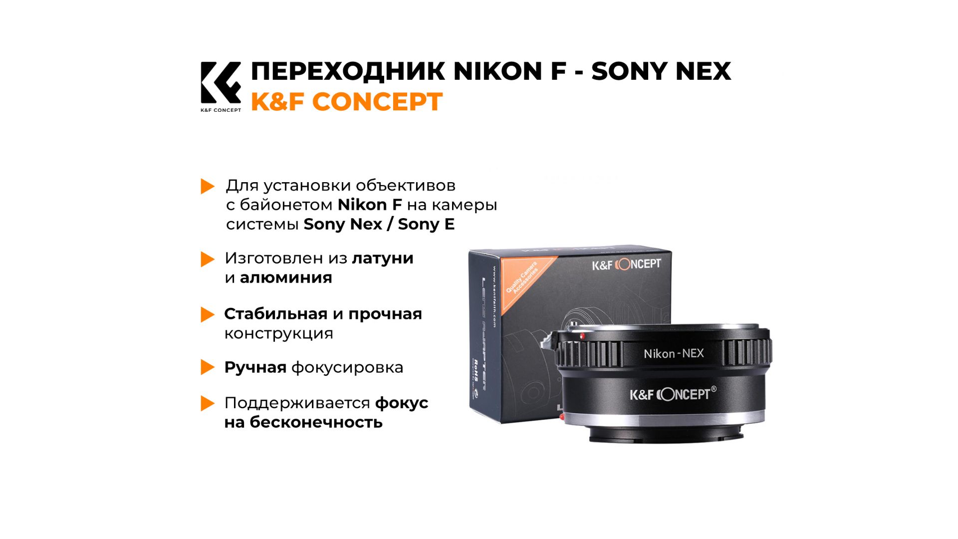 Новый оригинальный переходник Nikon F - Sony Nex / Sony E. В упаковке. Производитель K&F Concept.