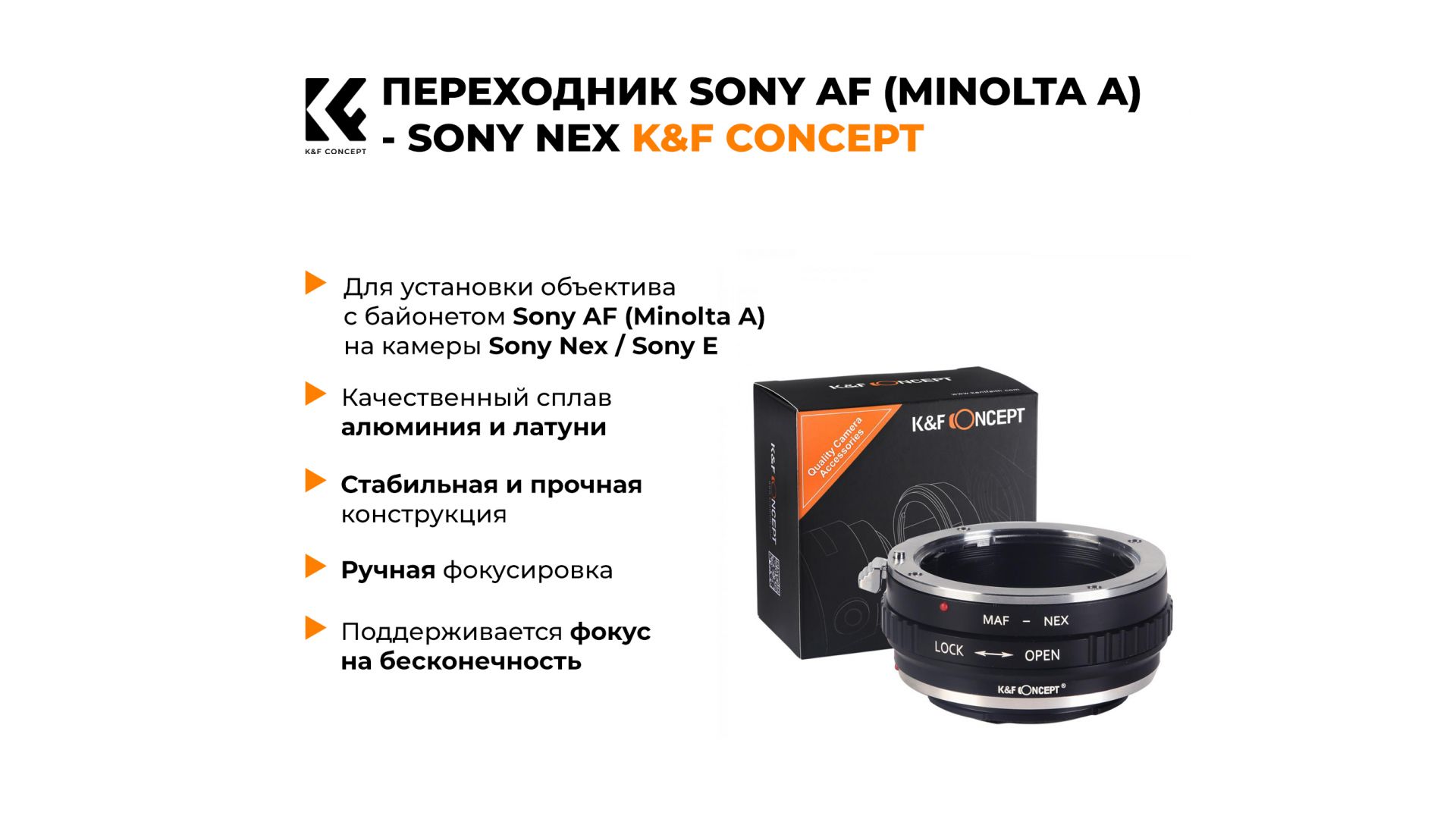Механический переходник K&F Concept Sony AF (Minolta A) – Sony Nex / Sony E позволяет использовать объективы с байонетом Sony A/Minolta A на беззеркальных камерах Sony с байонетом E (включая линейку Nex). Корпус адаптера изготовлен из прочного алюминиево-латунного сплава, обеспечивая надежную фиксацию и долгий срок службы. Поддерживается фокусировка на бесконечность. Автоматическая фокусировка и управление диафрагмой не поддерживаются — только ручной режим. Переходник не влияет на качество изображения, сохраняя оптические характеристики объектива. Артикул производителя: KF06.146.
