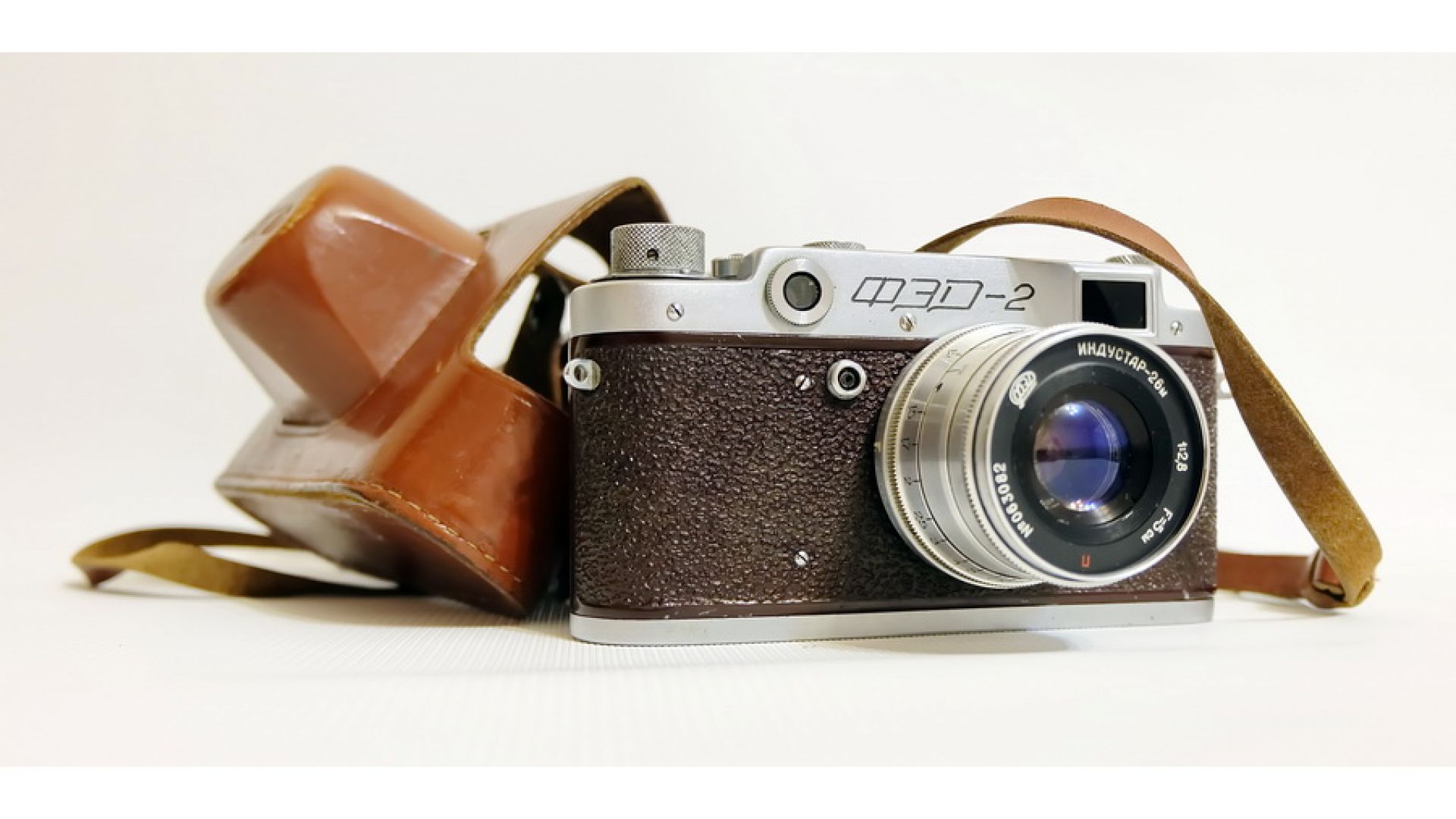 Советский пленочный дальномерный фотоаппарат Фэд 2 в редком исполнении - корпус темно-красного цвета.