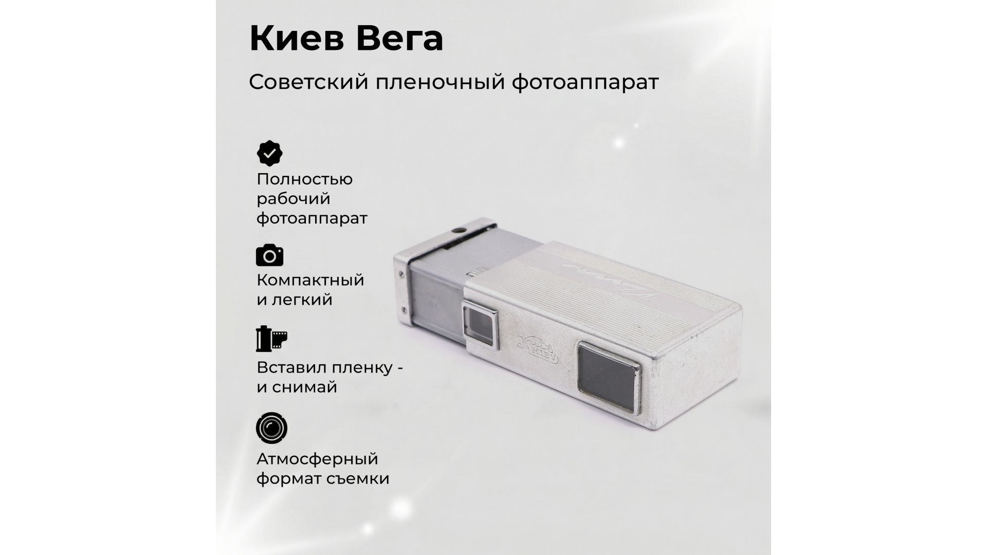 Киев-Вега — советский миниатюрный фотоаппарат, прототипом для которого послужила модель Minolta-16. Произведен Киевским заводом "Арсенал" в 1962 году. Редкая модификация с измененным теснением корпуса! Первые выпуски Киев-Вега в 1970 году имели характерную вырубку на верхней панели внешнего кожуха для доступа к спусковой кнопке. И слово «Вега» наносилось на переднюю панель, а не на верхнюю. Диафрагма двухлепестковая. Затвор шторный, с горизонтальным движением металлических шторок. Корпус — металлический, все механизмы камеры собраны во внутреннем светонепроницаемом корпусе.
