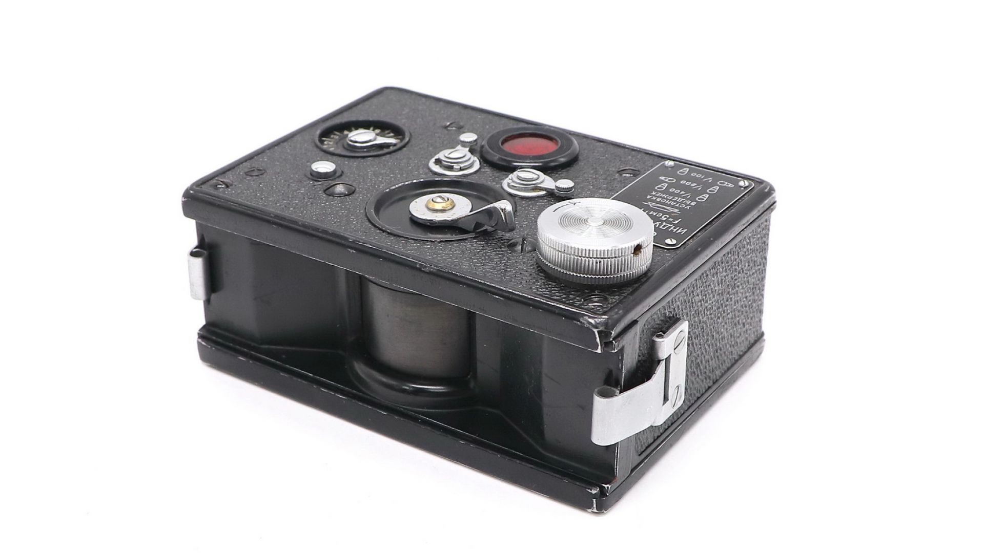 Тип затвора — механический, с выдержками 1/100, 1/200 и 1/400 с. Регулировка выдержек производится изменением скорости вращения барабана, для чего фотоаппарат снабжён двумя установочными рукоятками и специальной таблицей, показывающей необходимое положение рукояток для получения той или иной выдержки. Тип применяемого фотоматериала — перфорированная фотокиноплёнка шириной 35 мм (фотопленка типа 135) в специальных кассетах. Вместо приёмной катушки устанавливается вторая кассета. Обратная перемотка пленки невозможна. Взвод затвора и перемотка плёнки — раздельные. Размер кадра — 24×110 мм. На фотопленке типа 135-36 возможно получение 12 кадров.