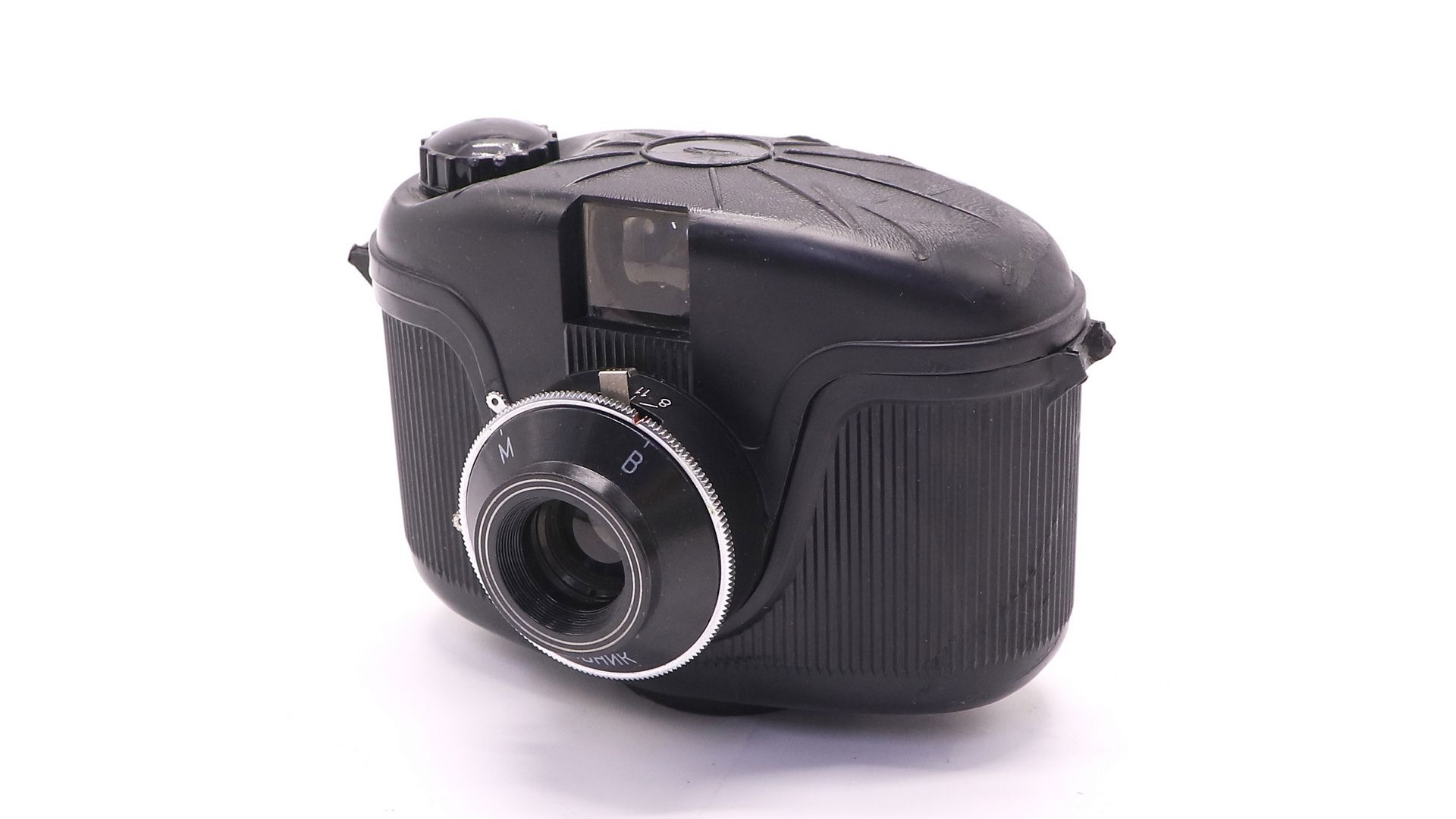 Трёхлепестковый центральный фотографический затвор, выдержки «М» — 1/60 (или 1/125) сек. и «В». Объектив «Ахромат» (двухлинзовый) 8/75, типа фикс-фокус, то есть неподвижно сфокусирован на гиперфокальное расстояние (резкость от 3,5 м до «бесконечности»). Диафрагма — металлическая пластина с тремя отверстиями разного диаметра. Значения диафрагм — f/8, f/11 и f/16. На диафрагме f/16 обеспечивается глубина резко изображаемого пространства от 2,5 м до «бесконечности». Корпус пластмассовый разъёмный. На задней стенке камеры имеется окно, закрытое светофильтром красного цвета, перемотка плёнки по цифрам на ракорде. Раздельный взвод затвора и перемотки плёнки. Спуск — кнопкой на оправе объектива. Тип применяемого фотоматериала — фотоплёнка шириной 60 мм (типа «Рольфильм»). Размер кадра — 60×60 мм. Количество кадров — 12.