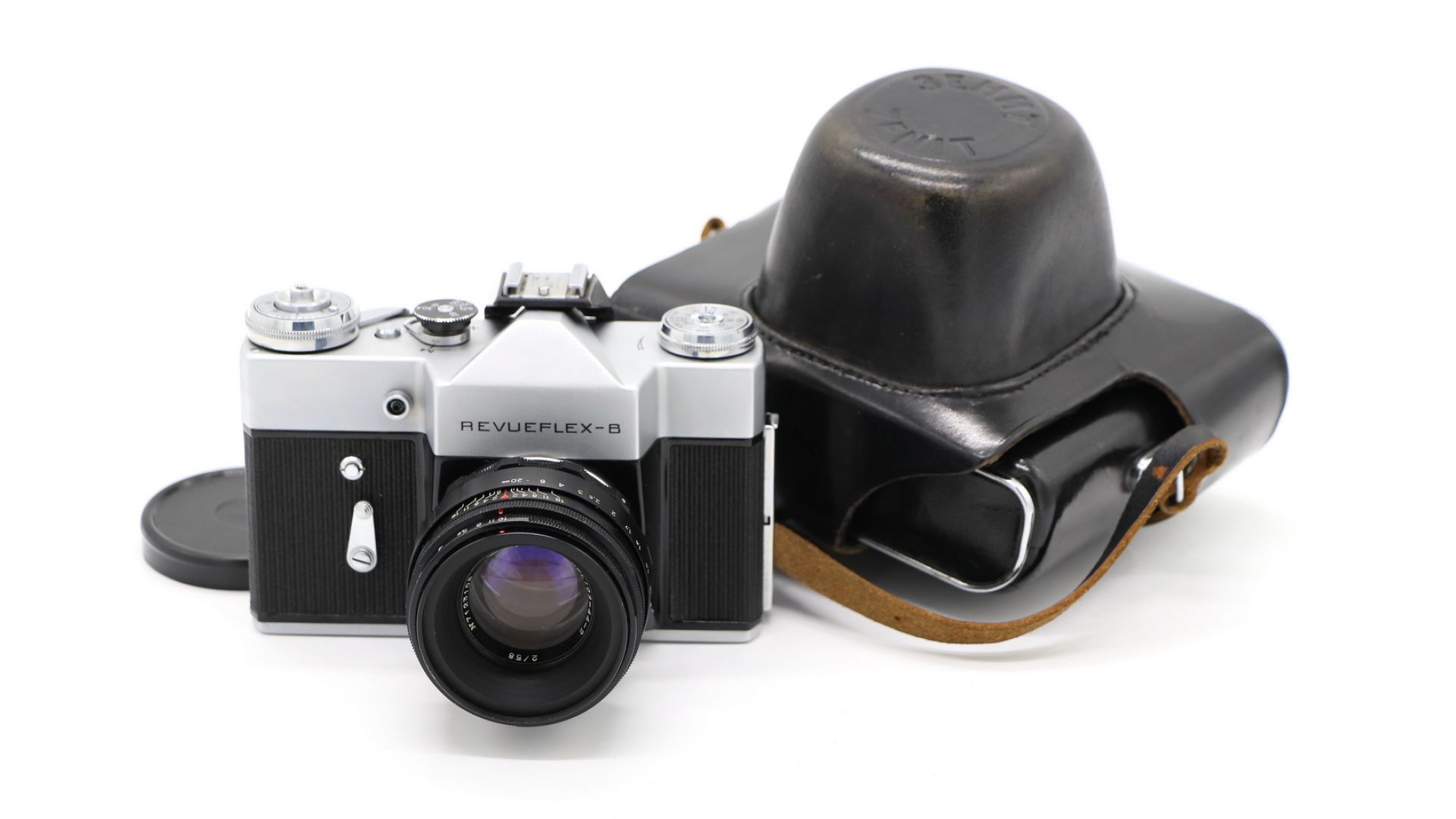 Достаточно редкий вариант нашего Зенит-В изготовленного на экспорт для Германии. Фотоаппарат Revueflex B относится к семейству однообъективных зеркальных фотоаппаратов с ручной установкой экспозиции. Видоискатель зеркальный с матовым стеклом. Имеет алюминиевый корпус с открывающейся задней стенкой и счётчик кадров с ручной установкой первого кадра. Эта модель также оснащена курковым взводом затвора и перемотки плёнки. Фотоматериал - типа 135, размер кадра 24×36 мм.