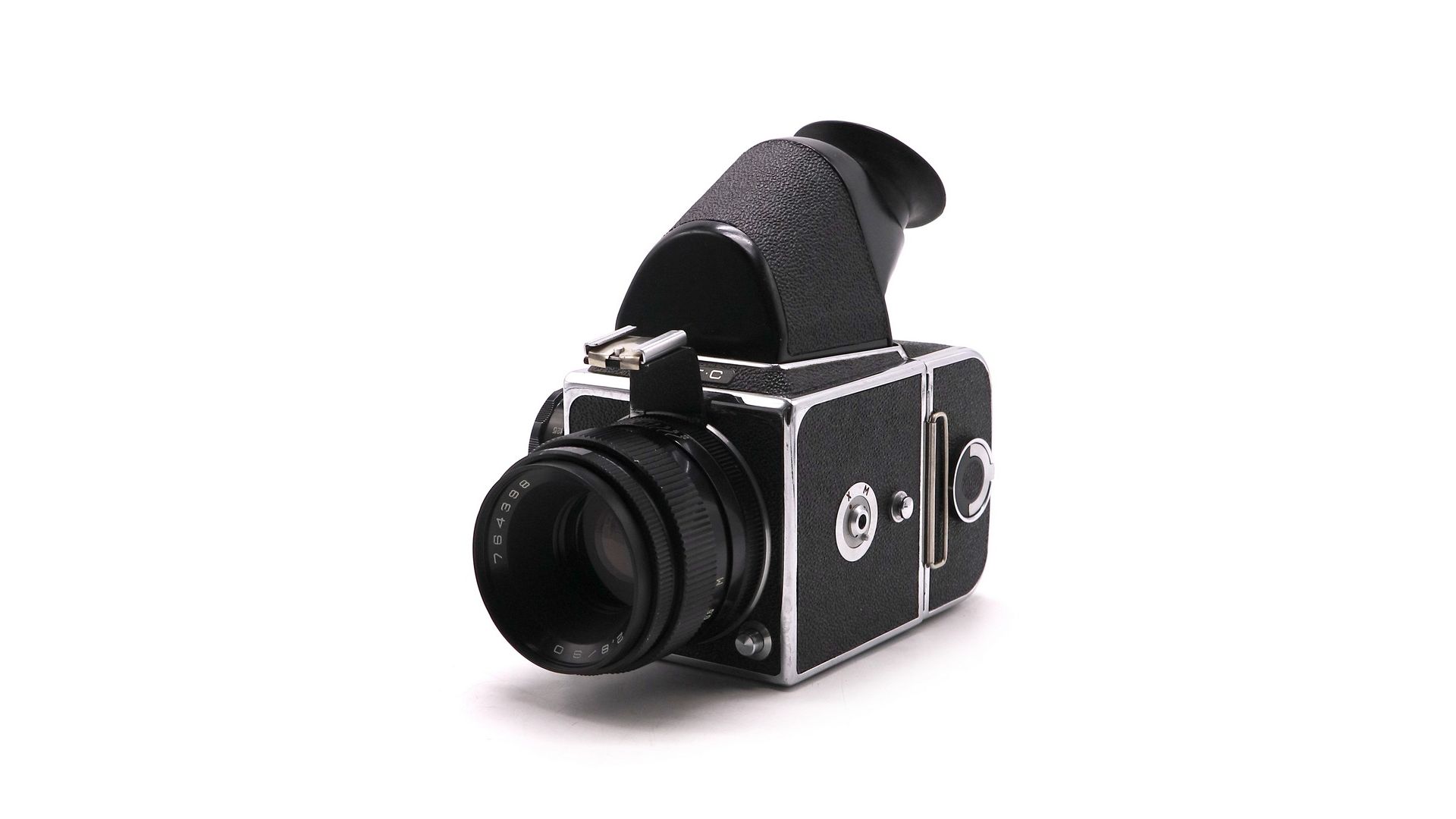 – Отличительные особенности среднеформатный кадр 6×6 см, плёнка типа 120 (12 кадров), объектив Вега-12В 2,8/90, прыгающая диафрагма, металлический затвор