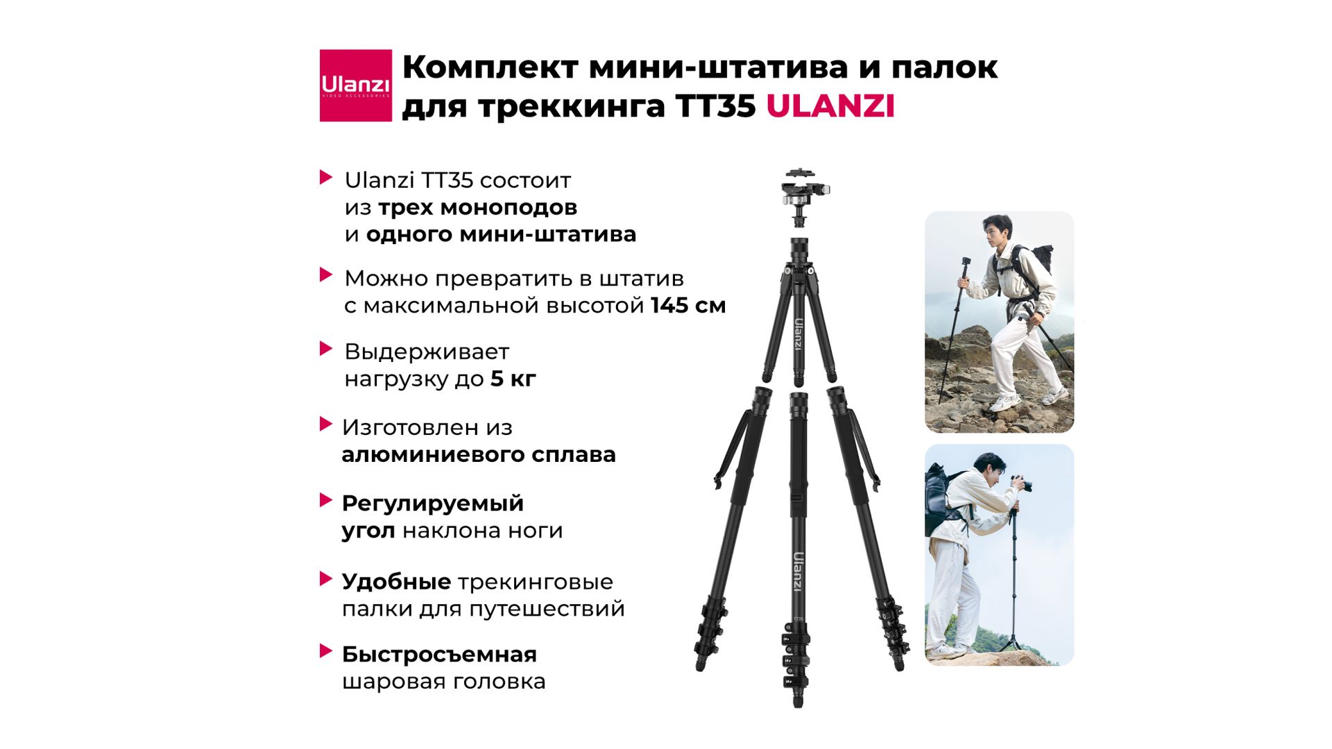 Ulanzi TT35 состоит из трех моноподов и одного мини-штатива, которые можно быстро трансформировать в устойчивый штатив максимальной высотой 145 см, обеспечивая надежность каждого снимка.