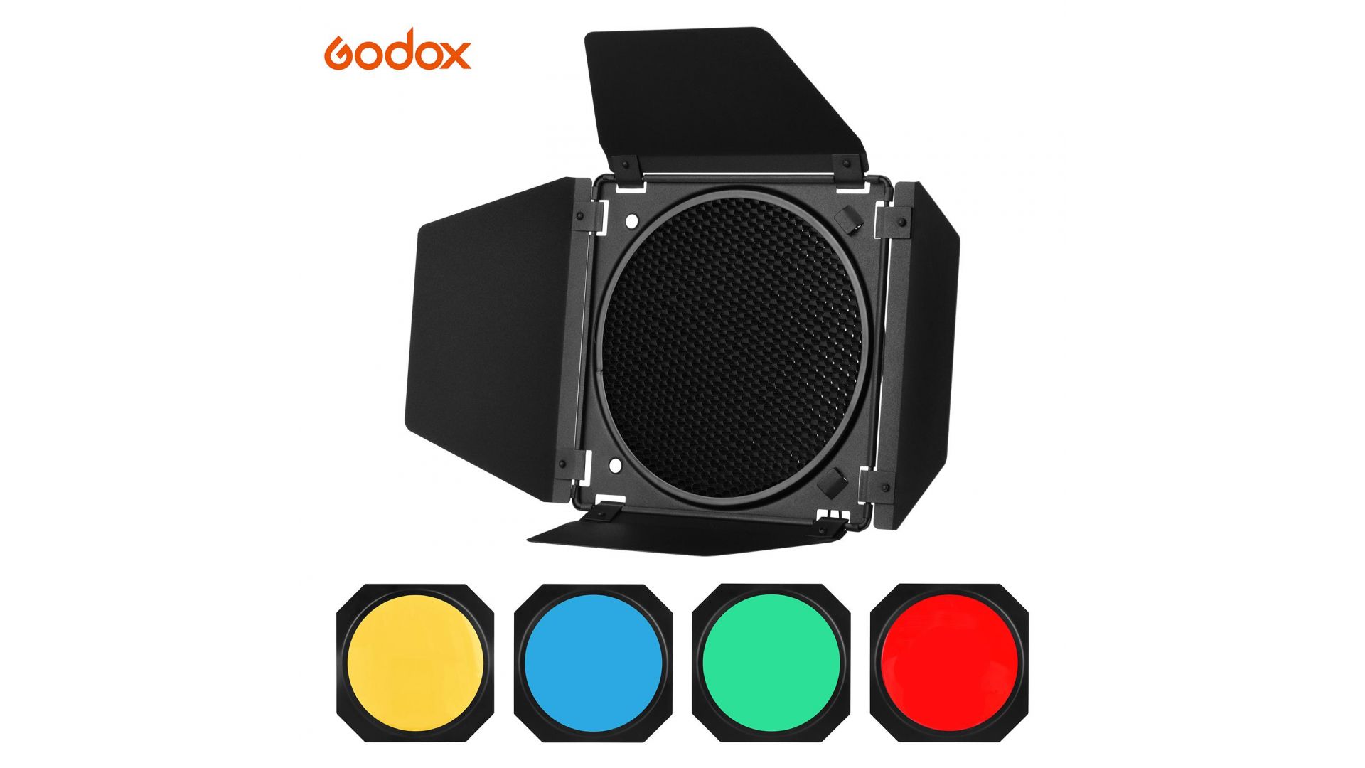Комплектация:Шторки Godox BD-04, сотовая насадка, цветные фильтры - 4 шт (желтый, красный, синий и зеленый)