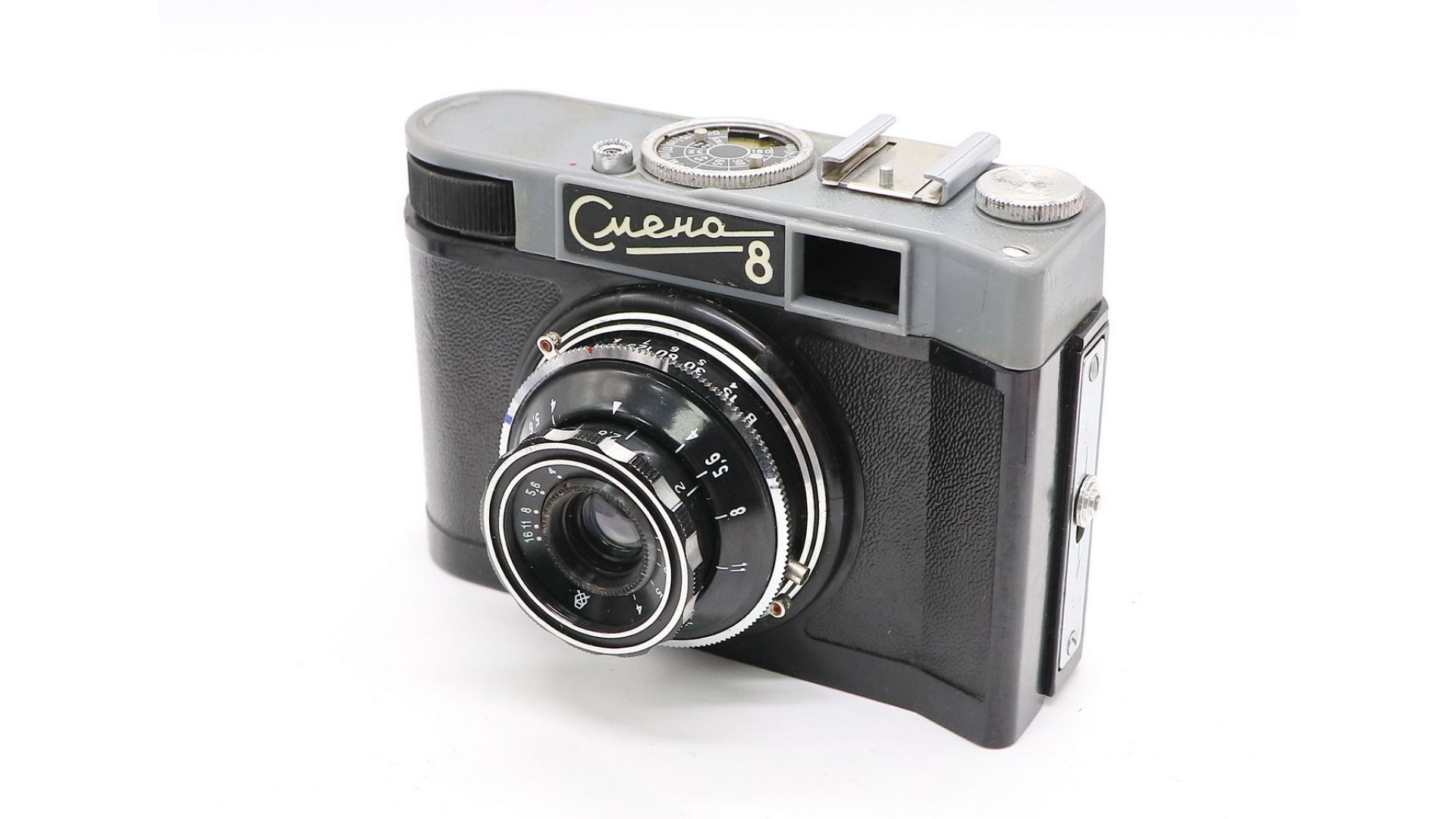 Смена 8 имеет несменный объектив с фокусным расстоянием 40 мм и светосилой 1:4, который снабжён ирисовой диафрагмой и механизмом наводки на резкость по шкале. Фотографический затвор — центральный, залинзовый, отрабатываемые выдержки — 1/15, 1/30, 1/60, 1/125, 1/250 и «В». Имеется автоспуск. Взвод затвора не сблокирован с перемоткой плёнки. Среди любителей плёнки фотоаппарат ценится за лёгкий вес, неприхотливость, минимальную (но достаточную!) функциональность и простоту ремонта.