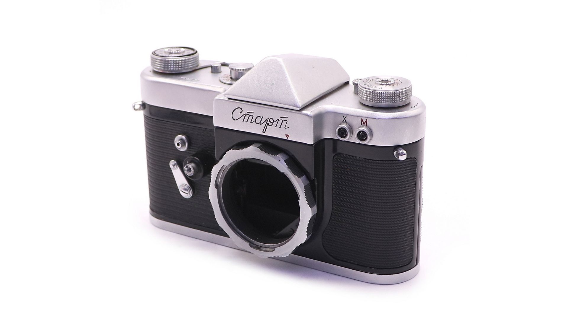 Затвор с анкерным механизмом задержки отрабатывает полный диапазон выдержек от 1/1000 до целой секунды. Зеркало «залипающего» типа, то есть опускается в рабочее положение только при взводе затвора. Задняя крышка — съёмная, с двумя поворотными замками. При отпирании крышки замки автоматически закрывают двухцилиндровые кассеты. Тип применяемого фотоматериала — перфорированная 35-мм киноплёнка. Вместо приёмной катушки можно устанавливать вторую кассету. Конструкция замков сдвижной крышки позволяет применять, кроме стандартных кассет с «бархоткой», шторные кассеты типа «Contax».