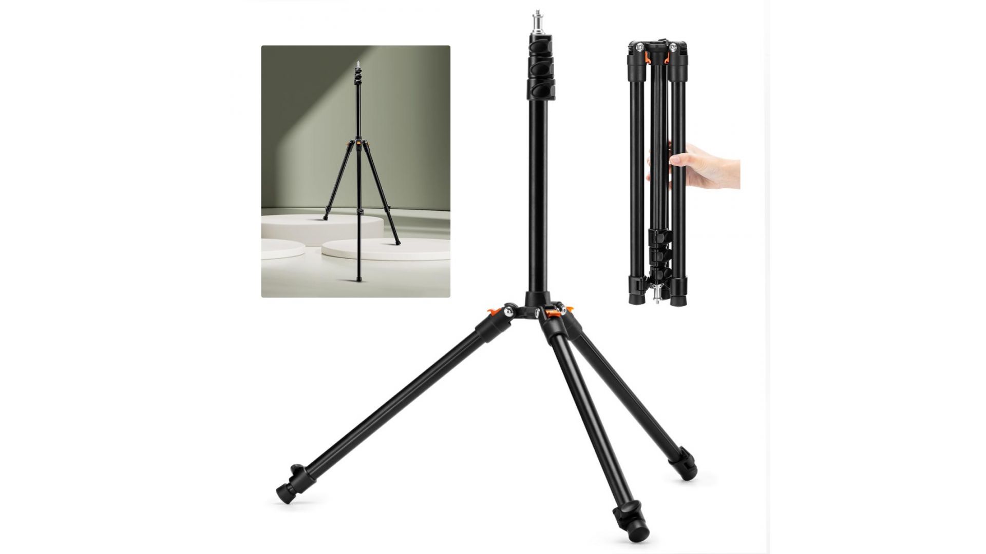 Оснащена быстрыми защелками для мгновенной установки. Для максимальной устойчивости на ветру предусмотрен крюк для груза и регулируемый угол раскладывания ног. Универсальная площадка с винтом 1/4" подходит для студийных вспышек, панелей, колец, софтбоксов, камер и даже смартфонов (с дополнительным держателем).
