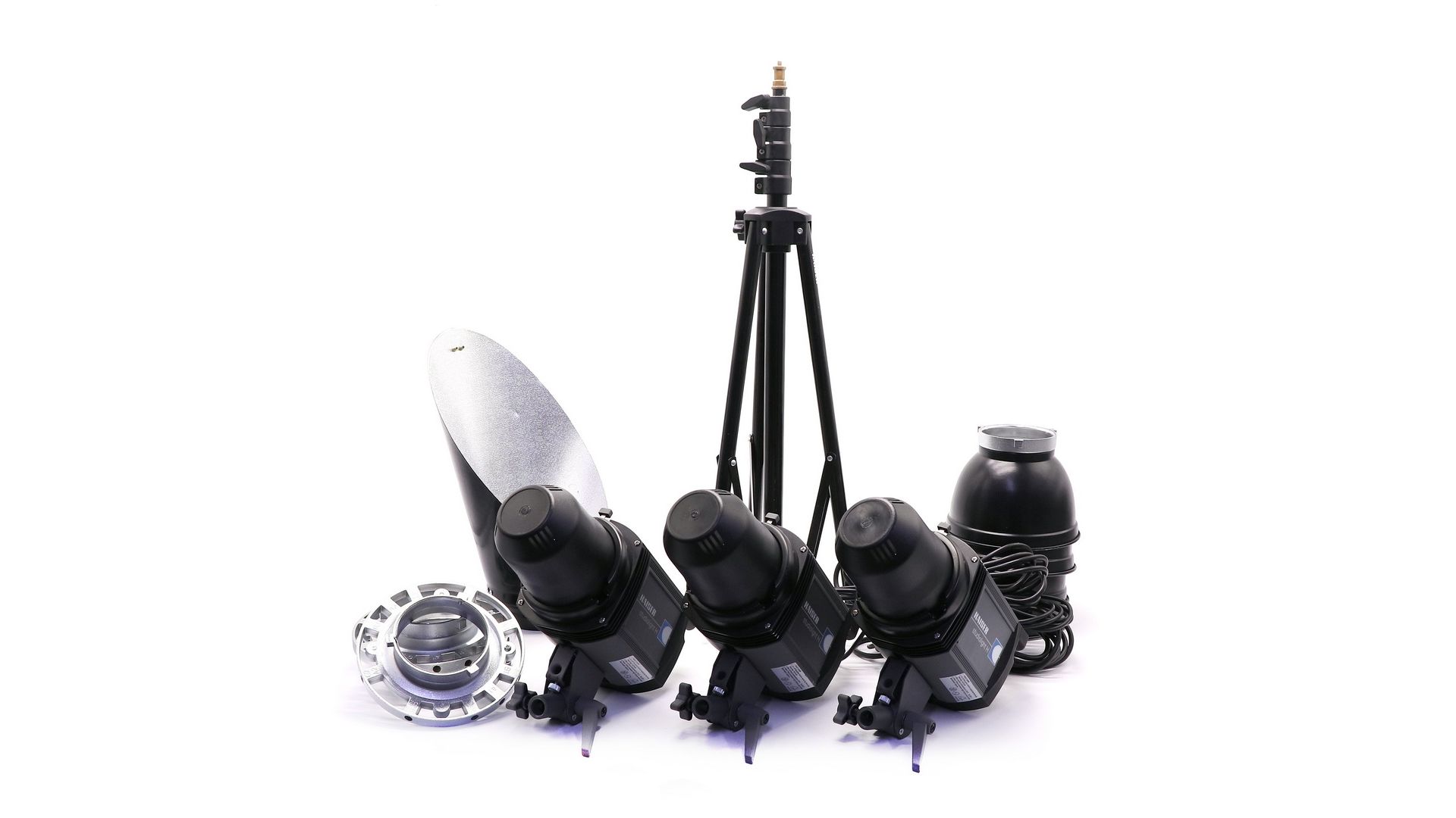 Комплектация:Две сумки, 3 осветителя StudioLight H1000, 3 защитных колпака, 4 рефлектора, 3 сетевых кабеля, 3 алюминиевых адаптера, стрипбокс 100х100см, два стрипбокса 60х60см, два зонта, ремень, стойка.