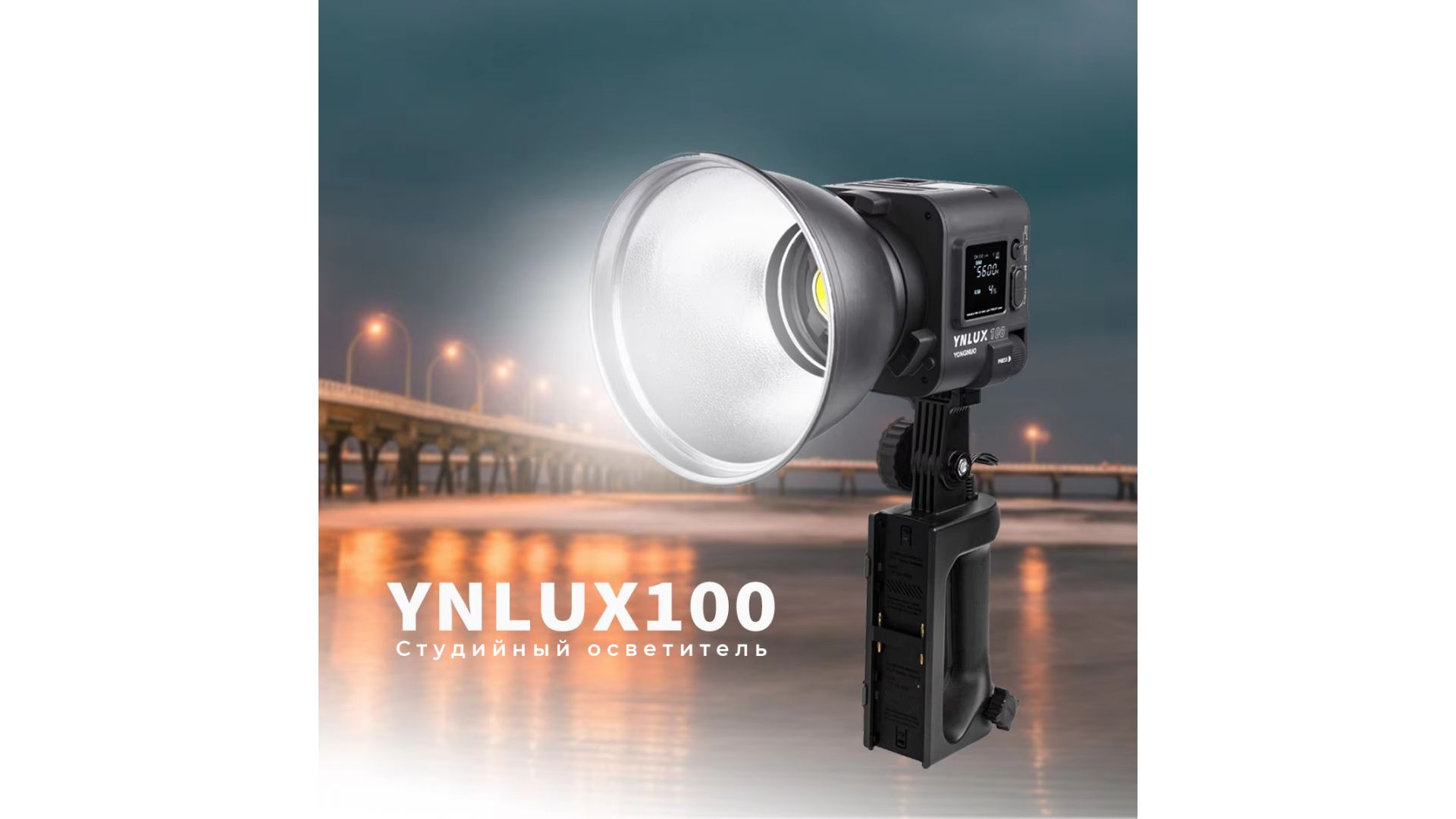 Для удобства есть возможность использовать специальную съемную ручку, которая крепится в нижней части YNLUX100. Гнездо для винта 1/4" позволяет устанавливать свет на штатив, стойку и другое студийное оборудование. Управлять осветителем можно с помощью приложения на смартфоне через Bluetooth (2,4G и 256 каналов) на расстоянии 15 м.