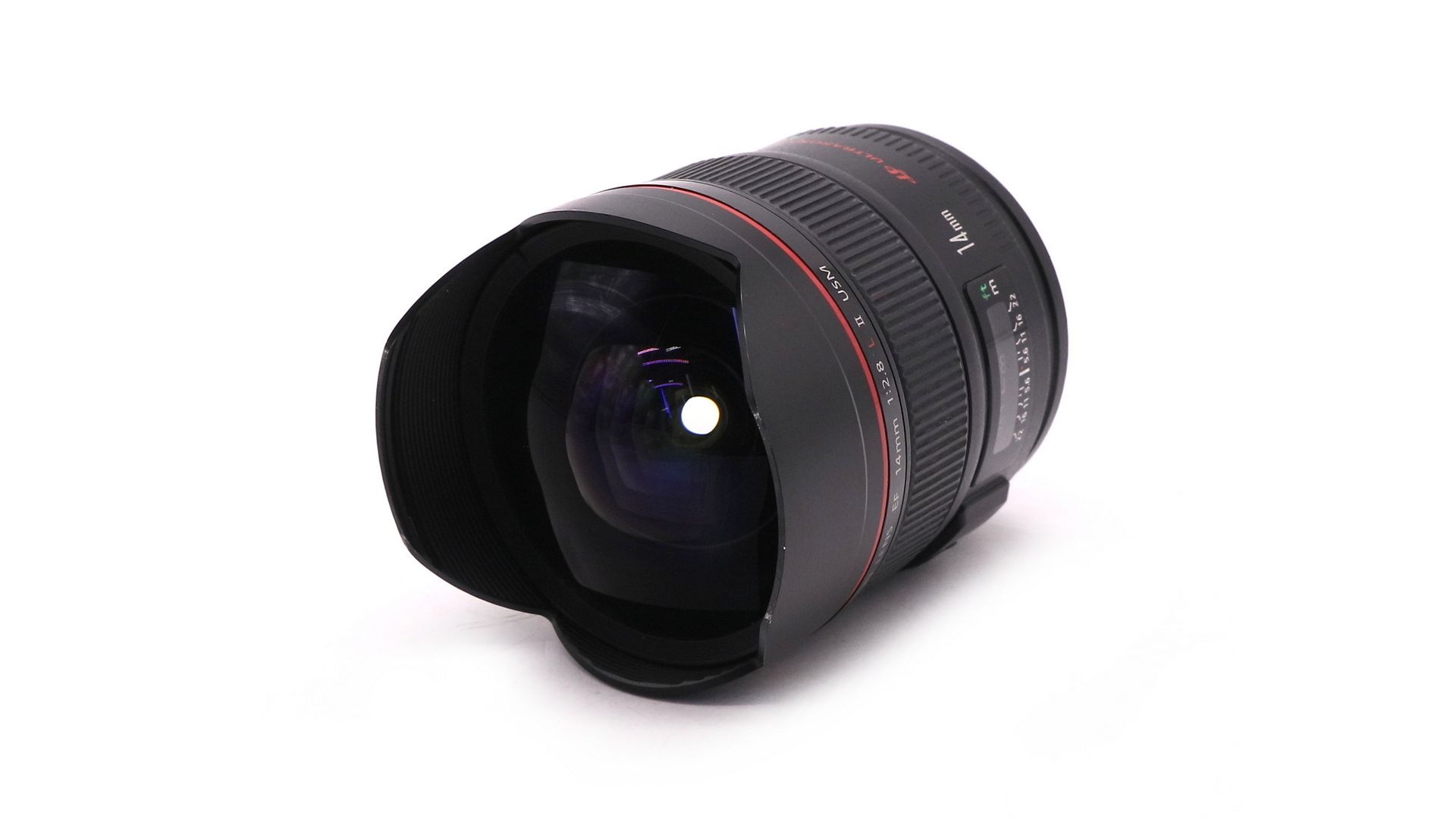 Оптическая схема: 14 элементов в 11 группах. Обладающий светосилой 2.8 объектив позволяет еще лучше и проще делать снимки в условиях плохого освещения без использования штатива или вспышки. Хорошая резкость на диафрагме 2.8. С диафрагмы 4 – очень резкий. Дисторсия очень не значительная. Встроенный ультразвуковой мотор кольцевого типа (USM) делает работу фокусировки быстрой и практически бесшумной. Фокусировка – внутренняя. В объективе Сanon EF 14 mm F 2.8L II USM предусмотрен переход от автоматической к ручной фокусировке. Красиво предает цвета, хорошо устойчив к контровому и боковому свету. Имеет небольшую встроенную лепестковую бленду.