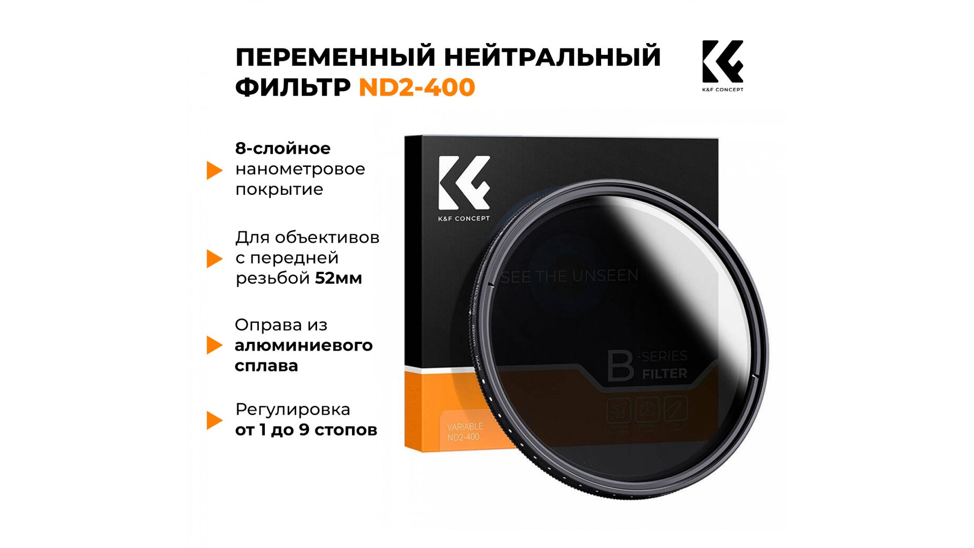 Новый оригинальный светофильтр KV32 Slim Variable/Fader NDX (ND2-ND400) 52мм. Производитель K&F Concept, Китай.