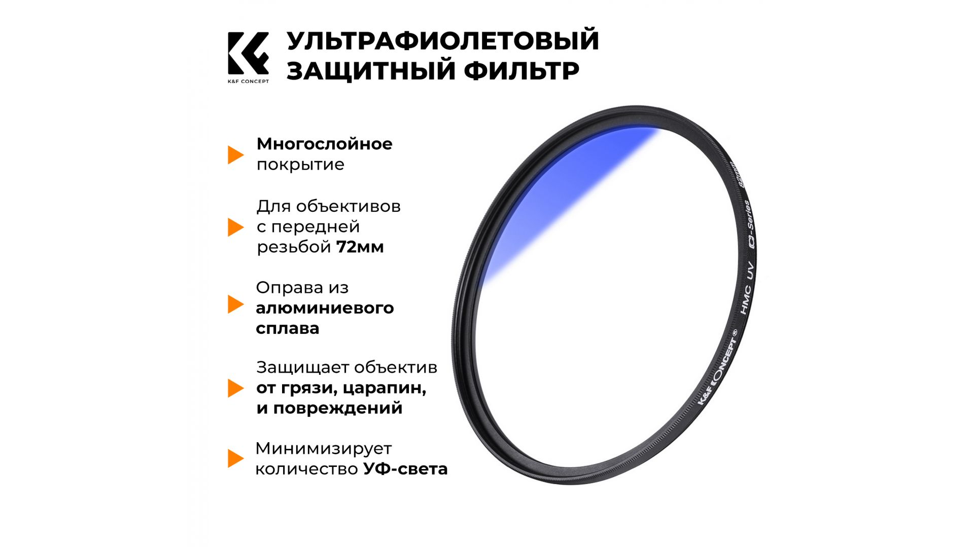 УФ-фильтр изготовлен из стекла, импортированного из Японии. Фильтр защищает объектив от грязи, царапин, отпечатков пальцев и случайных повреждений. Сверхтонкая и легкая алюминиевая рама максимально снижает влияние света и эффективно предотвращает появление темных углов при широкоугольной съемке. Этот УФ-фильтр уменьшает дымку и улучшает контраст видео и изображений за счет минимизации количества ультрафиолетового (УФ) света и устранения синеватого оттенка на изображениях.