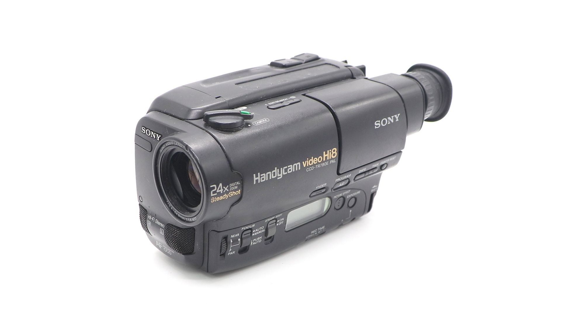 Видеокамера Hi8 (400 линий, Hi-Fi стерео-звук), PAL, число эл-тов матрицы - 570 тыс., 2 скорости записи/воспроизведения (SP/LP) до 4 часов на 1 кассету, электронный стабилизатор изображения при съемке с рук (SteadyShot 400тыс.эл-тов), быстрый/медленный "наезд" до 48х, auto/ручной фокус и диафрагма, автобаланс белого, выходы - НЧ-Video, S-video и антенный (ДМВ), L и R каналы звука, запись с внеших источников через A/V-вход.