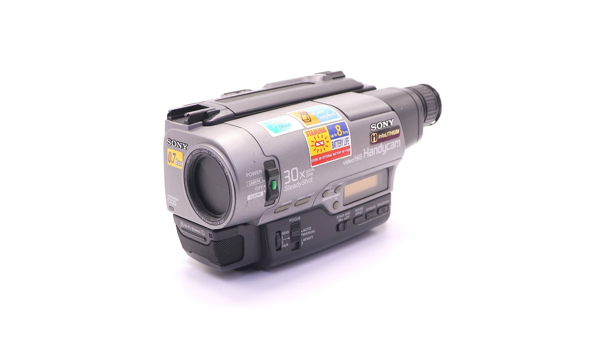 400 линий, Hi-Fi стерео-звук, PAL, число эл-тов матрицы - 570 тыс., 2 скорости записи/воспроизведения (SP/LP) до 4 часов на 1 кассету, электронный стабилизатор изображения при съемке с рук (SteadyShot 400тыс.эл-тов), быстрый/медленный "наезд" до 48х, auto/ручной фокус и диафрагма, автобаланс белого, выходы - НЧ-Video, S-video и антенный (ДМВ), L и R каналы звука, запись с внеших источников через A/V-вход.