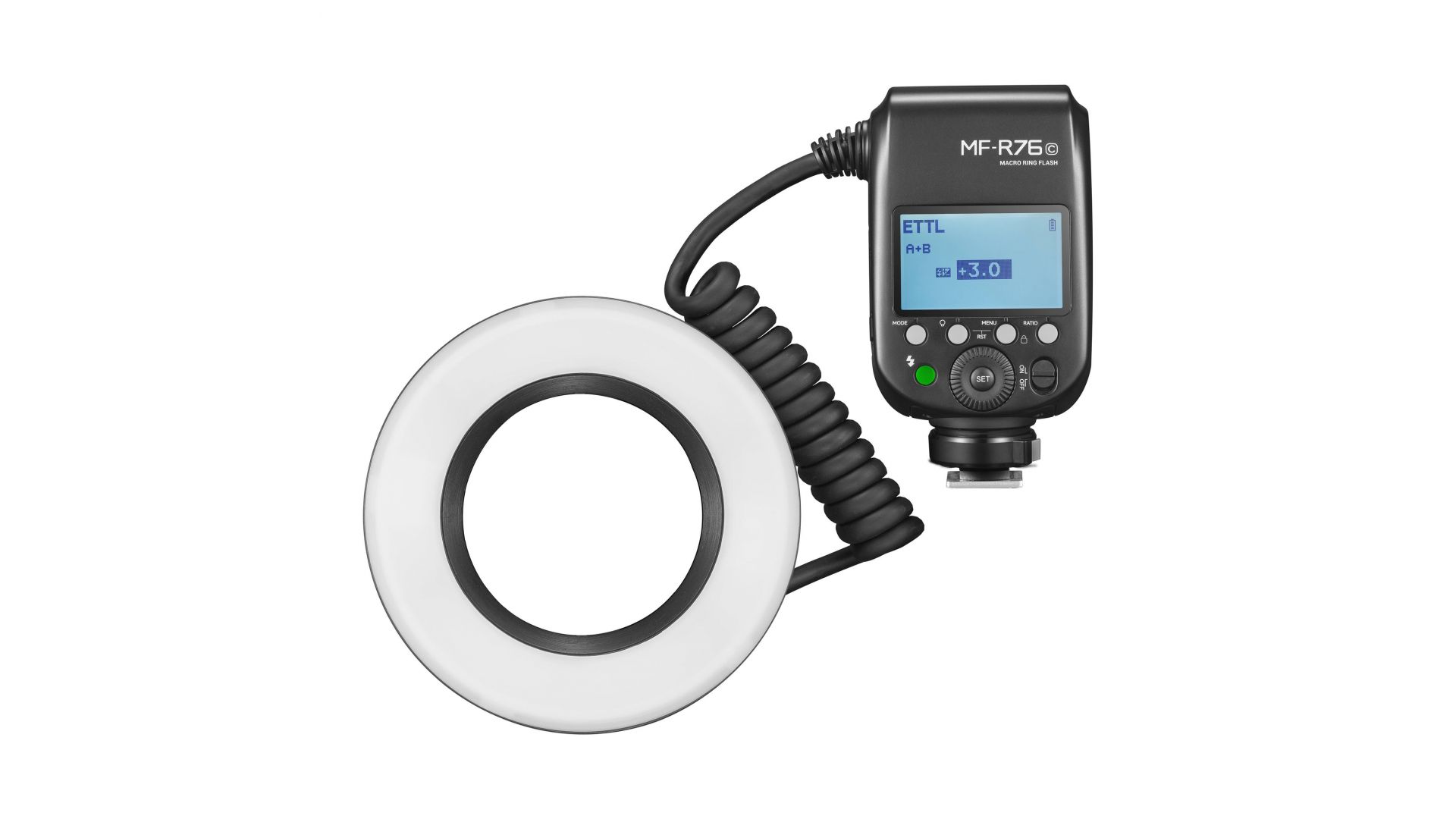 MF-R76C - кольцевая макровспышка в компактном корпусе, состоит из двух компонентов: контроллера, который вставляется в крепление «горячий башмак» DLSR-камеры, и кольцевой вспышки, которая крепится к объективу.