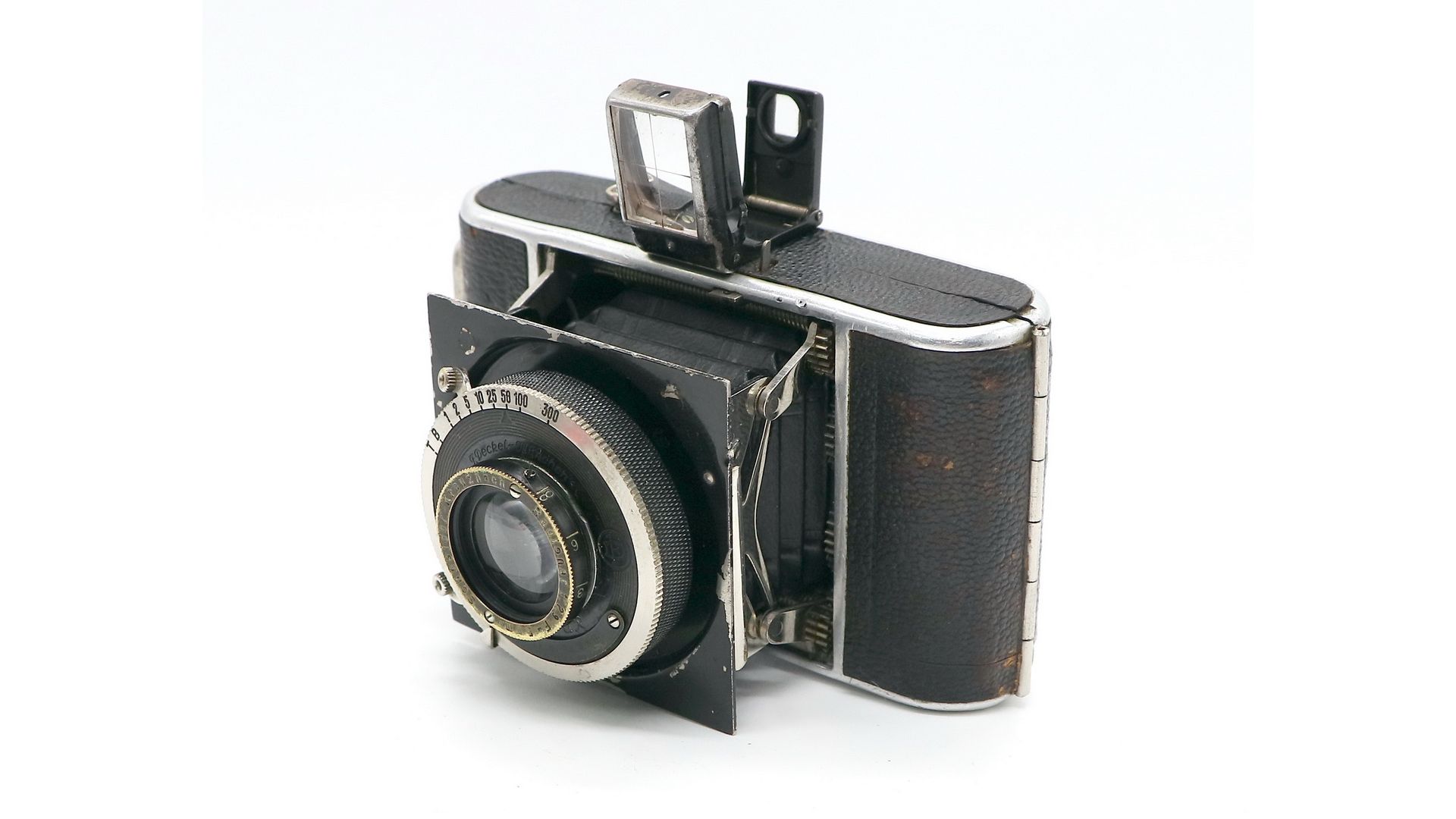 Это одна из самых компактных и легких камер в своем классе. Объектив Schneider-Kreuznach Radionar 5 см f/4.5, затвор Compur 300. На верхней пластине есть кнопка фиксатора, которая одновременно открывает и видоискатель, и механизм складывания. Камера делает 16 кадров 3x4 на пленку 127.