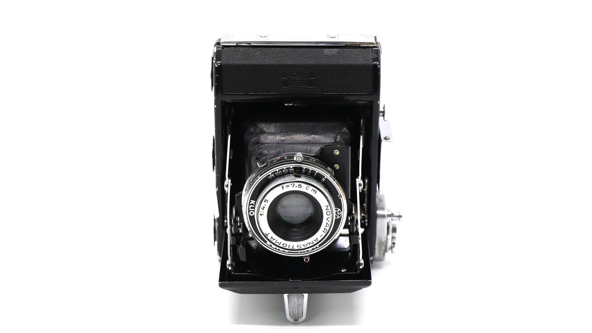 Данный экземпляр оснащен объективом Novar-Anastigmat 7.5cm f/4.5 и затвором Klio. Камера делает 8 кадров 6х9 на плёнке 120. Материал корпуса аллюминий. Отличный вариант для фотоэкспериментов!