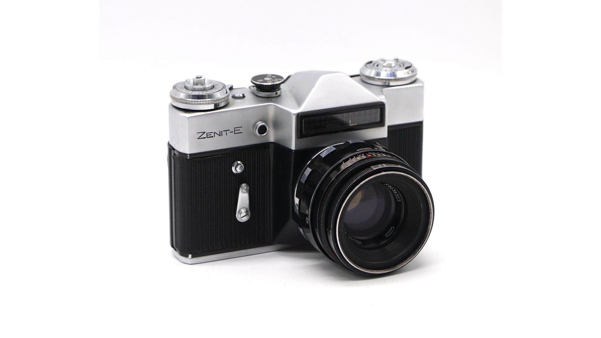 Зенит-Е - фотоаппарат со встроенным и несопряженным экспонометром и механизмом зеркала постоянного визирования. Зеркало постоянного визирования позволяет непрерывно наблюдать объект съёмки, кроме момента экспонирования. Встроенный экспонометр особенно ценен при работе с цветной пленкой. По своим техническим данным фотоаппарат "Зенит-Е" может применяться для любительских и целого ряда специальных съемок. Механизм зеркала постоянного визирования, встроенный экспонометр, рычажный взвод затвора, шарнирное крепление задней крышки, небольшие габариты и малый вес - все это важные достоинства данного экземпляра. Фотоматериал - пленка - 135, размеры 24×36 мм.