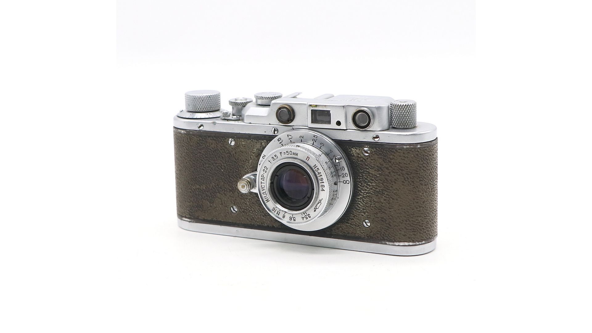 Объектив «Индустар‑22». Шторный затвор с выдержками от 1 с до 1/500 с + режим «В». Точный дальномер для фокусировки. Резьбовое крепление М39. Совместимость с 35‑мм плёнкой.