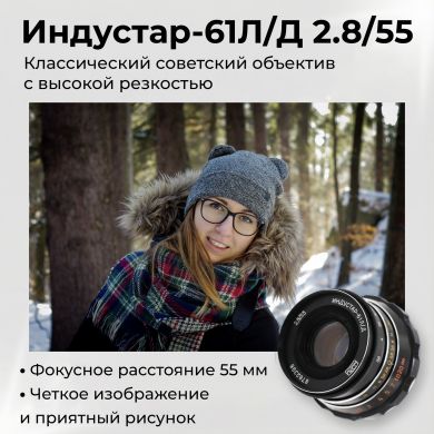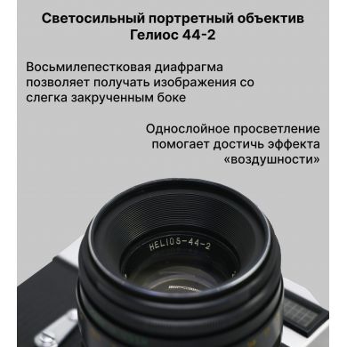 Объектив «Индустар‑50» с отличной резкостью. Шторный затвор с выдержками от 1 с до 1/1000 с + режим «В». Точный дальномер с клиновым устройством. Резьбовое крепление М39 под сменные объективы. Работа с 35‑мм плёнкой.